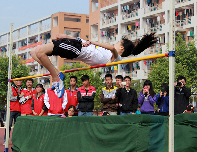 离弦箭似的助跑,蚂蚱似的起跳,腾向天空,一个漂亮的弧度,落地,完美地诠释了运动之美、生命之美。