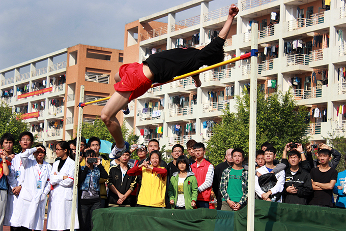 场上,各学院啦啦队高声呼喊学院口号,为比赛营造出热烈的气氛。当高度调整到1.2米时,孙晓纯一跃而过,文秋怡三跳未果,胜负已决。随后,孙晓纯挑战1.3米成功,高度被调整到破省大运会记录的1.41米,遗憾的是三跳未果,最终比赛成绩定格在1.3米。
