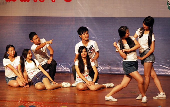 伴随着吉他协会动感的音乐,文艺晚会拉开了序幕。晚会节目类型多样,其中,歌舞剧《MV show》以人物夸张的表情动作表演掀起现场第一波高潮,舞蹈《青春狂想曲》、《cry cry》以其动感十足的舞姿赢得现场掌声不断,相声剧《不三搭不四》、哑剧《灰姑娘奇遇记》则通过角色反串方式使现场欢笑声连连,别具一格的小人舞《小人王国》更是赢得现场观众掌声不断。