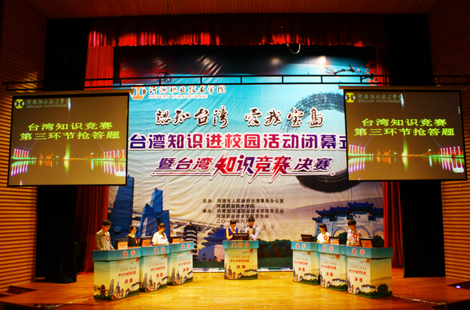 6月14日晚,以“认知台湾 爱我宝岛”为主题的首届台湾知识进校园系列活动闭幕式暨台湾知识竞赛决赛于我校报告厅圆满落幕,河源市人民政府台湾事务办公室主任谢柱、副主任李斌、副调研员蓝国平,我校副校长赖小景,团委全体老师、各学院团总支书记、校级各大组织学生代表及各学院参赛队员参加了活动。