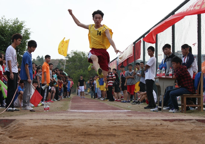 下午3点,学生男子跳远决赛在学校田径场上进行。助跑、跳跃、落地,运动员们脚下的沙子像烟花般绽开。充满激情的心,配合流畅的动作,完美地诠释了跳远的运动美。