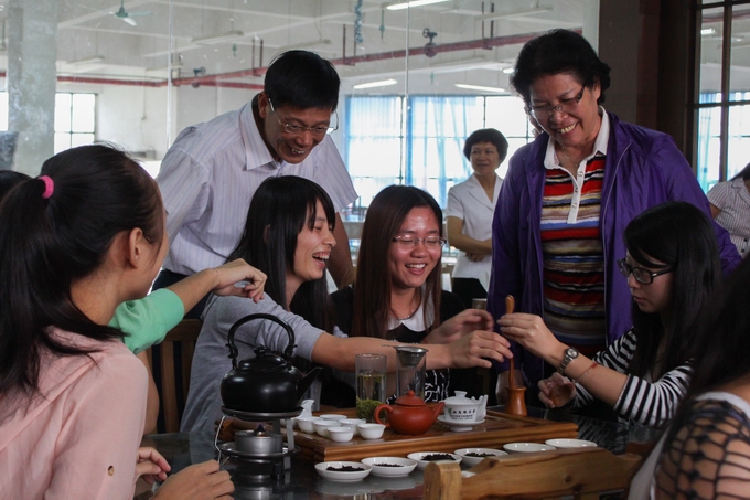 下午,省妇联一行到校后,首先来到“才情女性”之茶文化的课堂上。记者观察到,任课老师以新颖的语言与亲和的授课方式,介绍茶的分类和特点、茶的文化内涵以及不同茶的沏泡方式等知识。省妇联一行认为以有深厚历史和广泛普及面的茶文化开篇,可以很好地吸引同学们投入到学堂课程中来。
