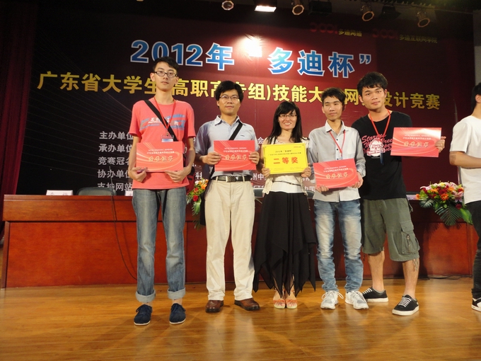 6月3日,2012年广东省高校大学生(高职高专组)IT专业技能大赛“多迪杯”网页设计竞赛总决赛在广东农工商职业技术学院隆重举行,全省共有41所高职院校的57个代表队参加了此次决赛。我校是首次参加省级的网页设计大赛,由我校电子与信息工程学院计算机多媒体技术专业师生组成的“点创”代表队,通过与其他院校的激烈角逐,冲出重围,获二等奖,另有未进入决赛的五支队伍获得三等奖。