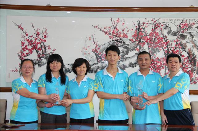 在4月21日结束的市区第二届“移动杯” 乒乓球赛中,我校教职工乒乓球队努力拼搏,取得了男子团体冠军、女子团体第三名及个人单打冠亚军等好成绩,为学校争得了荣誉。其中,曲建国老师获处级以上领导干部组男子单打冠军,谢振明老师获普通组男子单打亚军,刘冠军老师获处级以上领导干部组男子单打第四名。