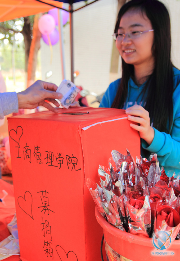 (文字/刘炳权)“同学快来看一看!好人有好报,献爱心送玫瑰啦!”3月7日,下着蒙蒙细雨,我校工商管理学院志愿者在A区食堂门口、B区宿舍门口搭起简易的帐篷,“卖”起了“爱心”。