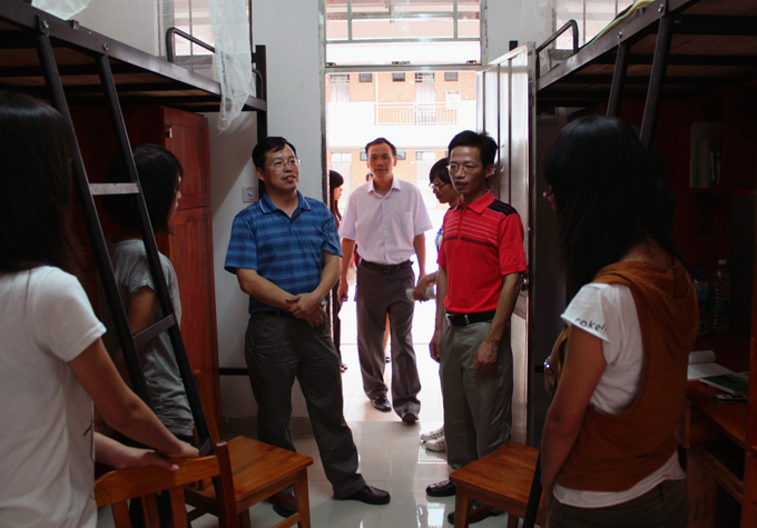 调研会结束后,韦荣还到新生宿舍看望学生。详细询问新生生活、军训、安全等各方面的情况。并叮嘱新生要及时调节自己以适应大学新生活;要好好利用在校宝贵的学习时间以好好读书,回报社会;有困难或疑问要向辅导员或相关人员反映以及时解决。