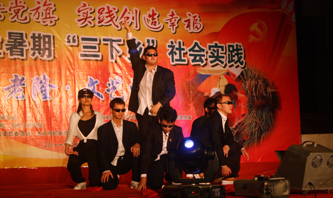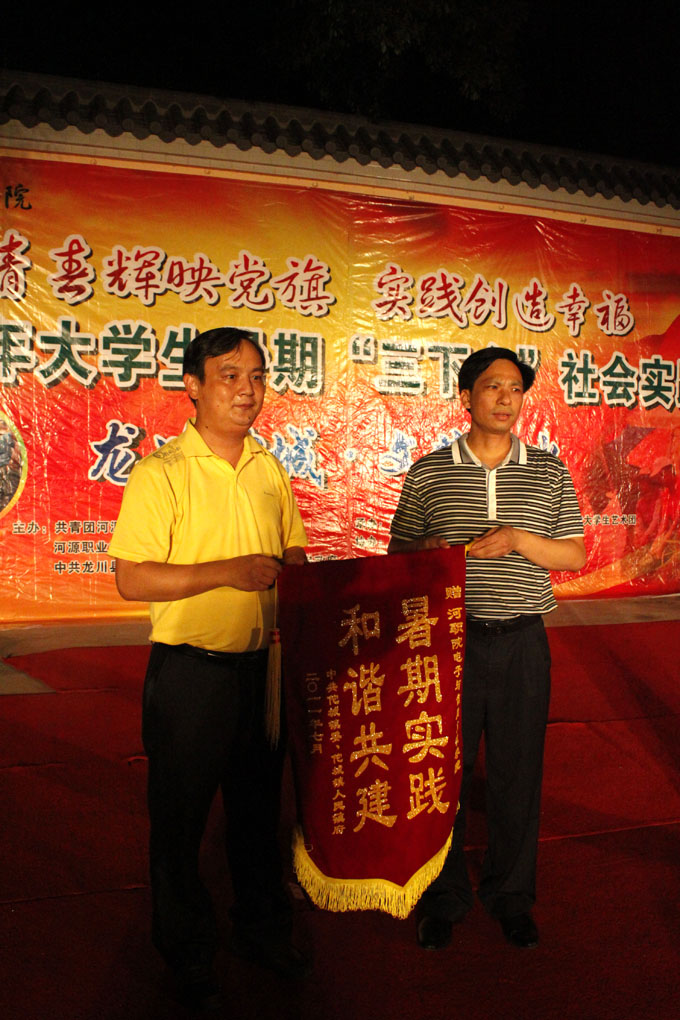 7月19日至20日,在为期九天的“三下乡”龙川服务点社会实践活动结束之际,我校2011年大学生暑期“三下乡”社会实践活动文艺队先后在在龙川县老隆镇水贝村文化广场、佗城镇镇政府为当地群众献上了精彩的文艺汇演。当地镇委、村委相关干部领导、我校团委、人文学院、机电工程和电信学院等有关负责人等出席了晚会。