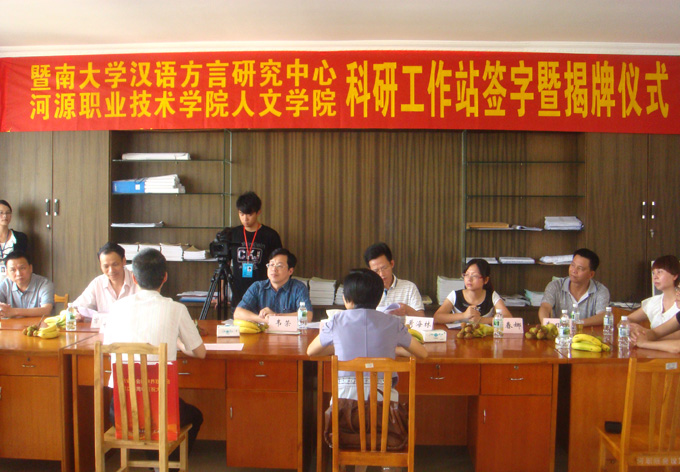 在揭牌仪式上,韦荣副书记首先致辞。他说,暨南大学汉语方言研究中心必一手机登录入口科研工作站落成对我校开展客家方言调查研究以及客家历史文化的研究提供了极大的便利,对河源地区的客家方言调查与研究具有深远意义,并要求主要承担此工作的人文学院能借科研工作站落成的契机在客家方言研究等方面提升科研水平。接着,甘于恩教授致辞。他简要地介绍了暨南大学汉语言方言研究中心的研究方向和学科建设等相关情况,并希望今后进一步加强与我校的合作,开展对河源地区方言资源研究和应用。之后,人文学院院长黄海林和暨南大学汉语方言研究中心主任甘于恩教授共同签署《暨大汉语方言研究中心与必一手机登录入口人文学院关于联合建立必一手机登录入口科研工作站的协议书》,并为该科研工作站揭牌。最后,暨南大学汉语言方言研究中心的专家与我校人文学院的教师座谈,并向我校赠送有关方言著作一批。