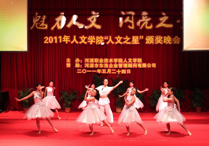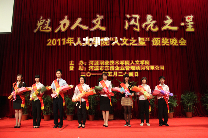 5月24日,人文学院于学术报告厅举行2011年人文学院“人文之星”颁奖晚会。晚会以“魅力人文,闪亮之星”为主题,分别嘉奖了在“技能”、“创业”、“干部”、“爱心”、“诚信”、“文明”、“励志”、“孝顺”方面有突出表现的同学。党委书记高仁泽、副书记韦荣、河源市东浩企业管理顾问有限公司总经理王云全、学工处、人文学院相关人员,以及部分师生代表参加了此次晚会。