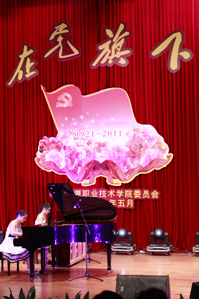 晚会还带来了由梁山、邝茂华老师演唱的,由纪委副书记赖小景作词谱曲的校歌。最后,整场晚会在歌曲《在党旗下》雄壮激昂的歌声中落下帷幕。