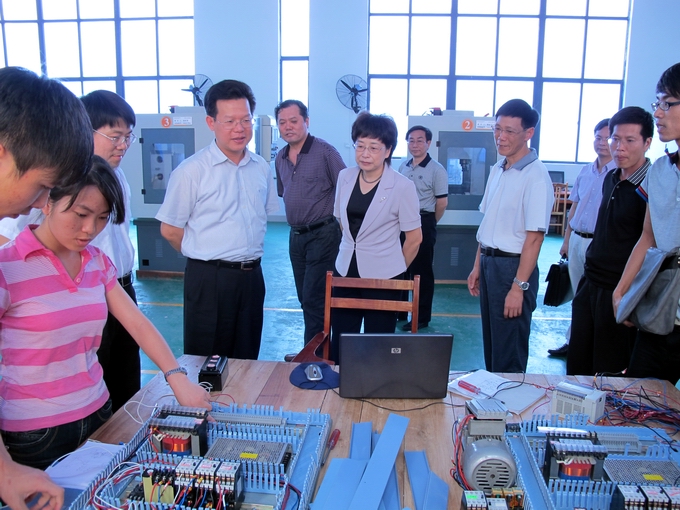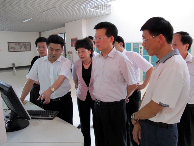 彭建文一行首先参观了实训中心。他饶有兴趣地察看正在动手实操的学生,向同学们了解实训设备情况。他为我校拥有先进、完备的实训设备感到高兴,对教学做一体化理念表示十分赞赏。随后,来访领导来到图书馆,彭建文了解了馆中藏书情况,还亲自尝试使用图书查询系统及自动借阅系统。我校领导热情接待了来访一行。
