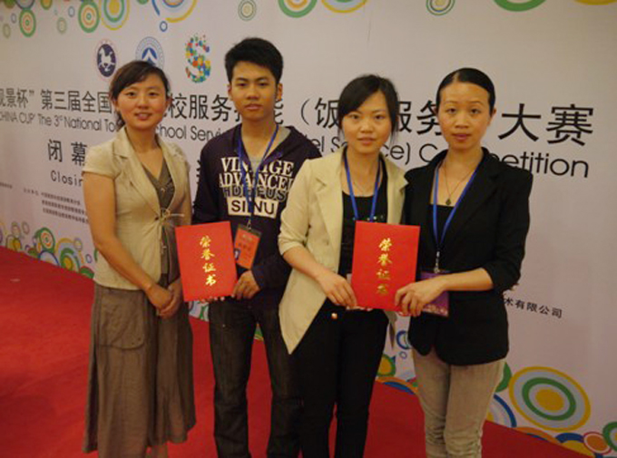 此次比赛我校由史万莉、黄蔚红老师带领08级酒店管理班周毅帆、09级酒店管理班岑雪娟两名同学参加。经过三天紧张、激烈、精彩的比拼,我校的两位参赛同学分别在理论测试、仪容仪表、英语口试、技能考核四个环节中均表现优异,