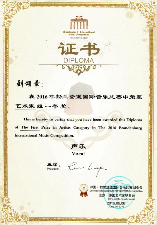 第二届德国勃兰登堡国际音乐比赛南赛区于2016年6月6日在广州举行,来自华南地区共有150多名参赛选手参与竞赛。经过多轮激烈的舞台竞技、争夺, 我校刘颂章老师荣获艺术家组华南赛区一等奖。