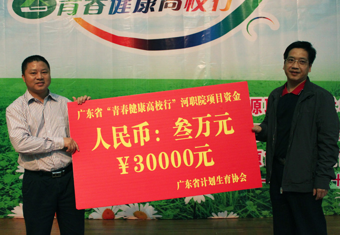 3月15日,广东省“青春健康高校行”活动河职院项目点启动仪式在我校学术报告厅举行。仪式上,副市长张丽萍和校长刘安华分别作了讲话,市计生局相关领导为我校提供广东省计生协“生育关怀――青春健康高校行”项目资金3万元,并为志愿者授旗,副校长陈农心主持了仪式。各二级学院相关负责人、辅导员、师生代表出席了此次启动仪式。