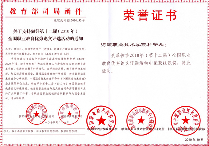 近日,教育部职业教育与成人教育司公布了第十二届全国职业教育优秀论文评选活动的最终结果,我校选送的论文有7篇获得了奖项,其中二等奖1篇,三等奖6篇,而科研处还被授予全国职业教育优秀论文评选活动优秀组织奖。
