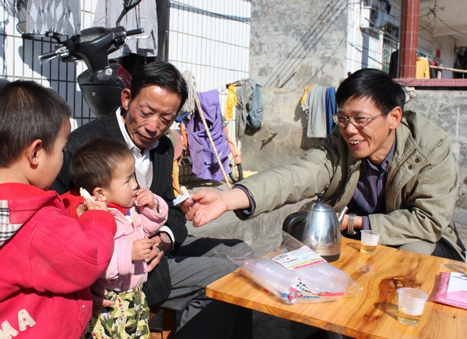 “小朋友,来,吃糖!”――高仁泽书记与贫困户一家亲切交流