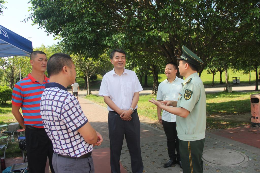 陈德清校长在现场认真地听取了保卫处、学工处相关负责人的工作汇报,详细地了解新生军训与入学教育的内容、军训教官的食宿等情况;市武警支队军训负责人向陈德清校长介绍了此次军训的科目与进展情况。