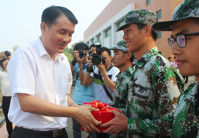 在表彰环节上,唐汉芳副校长宣读表彰军训暨入学教育优秀学员的决定,陈德清校长为优秀学员代表颁发证书。段邦贤书记、韦荣副书记、赖小景副校长、王小宁副校长分别为第一、二、三等奖以及优秀奖的各学院代表颁发锦旗。