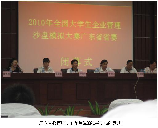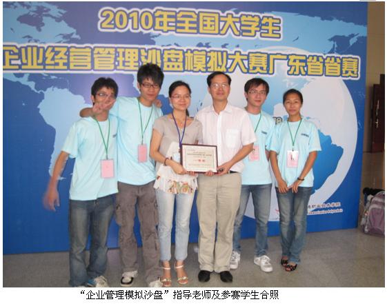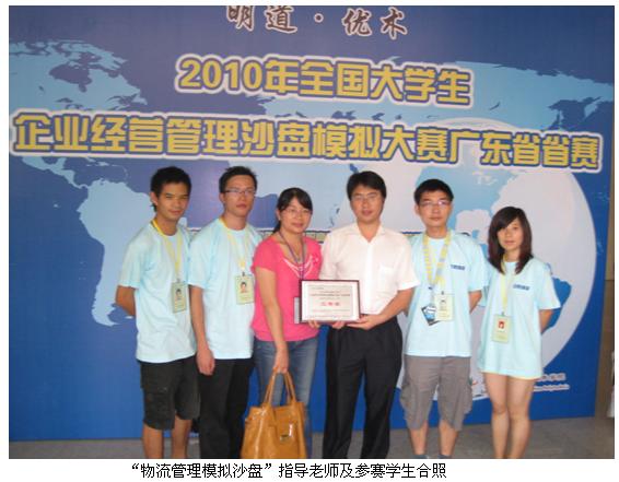 在2010年6月24日至25日举行的“2010年全国大学生企业经营管理沙盘模拟大赛广东省省赛”中,经过激烈的角逐,我校两支参赛队伍分别在“企业管理模拟沙盘”和“物流管理模拟沙盘”中分别获得一等奖和三等奖。