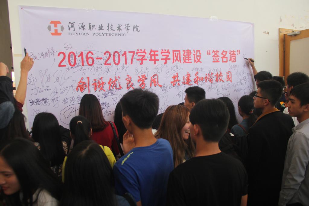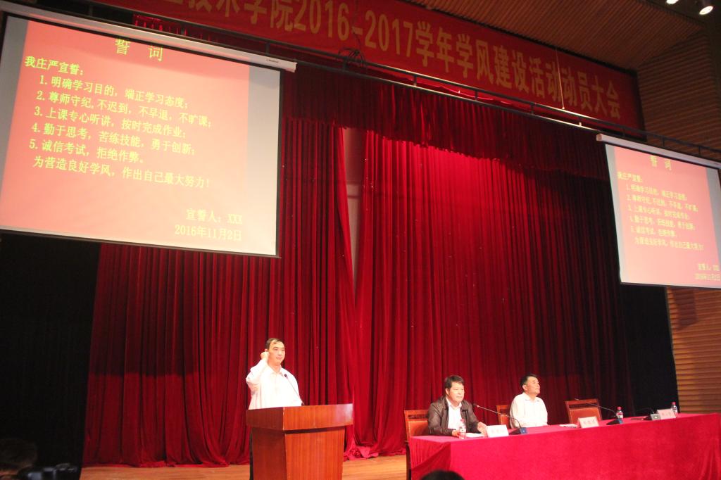 大会最后,在赖小景副校长的带领下,学生全体起立,庄严宣誓,决心以实际行动,从我做起,全力创设优良学风。随后,师生们还共同参与了学风建设签名活动,表达了师生们参与学风建设活动的强烈意愿与共同打造良好学风的决心。