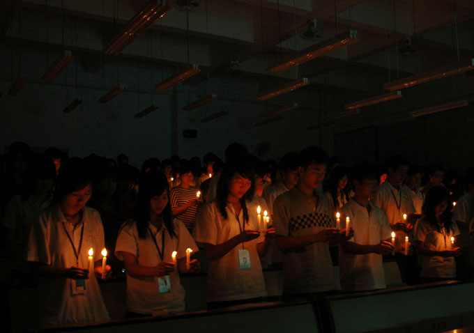 没有闪亮的灯光,没有动听的歌声,更没有响亮的掌声,只有那一幅幅当初令所有人感动的救援画面,也只有现场点燃着充满希望的烛光。在观看了5・12汶川地震的相关视频后,现场同学们点燃手中的蜡烛,并为在地震中遇难的四川同胞哀悼一分钟。
