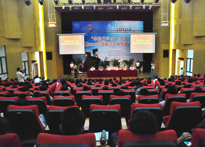 5月10日,华达助学金签约暨2010年度助学金颁发仪式在学术报告厅举行。100名优秀学生获得了华达助学金的资助。校长刘安华、副校长陈农心、河源华达集团有限公司董事副总经理刘守和及其代表出席了此次签约颁奖仪式,并分别为获奖的学生颁发助学金。