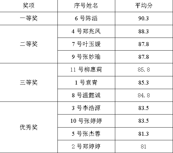 演讲比赛结束后,评委老师针对选手们在演讲过程中的问题进行点评,并综合各方面表现进行评分。最终,6号选手陈滔以平均分90.3的高分荣获一等奖,4号选手郑兆凤、7号选手叶玉媛、9号选手张妙瑜分别以平均分88.3、87.8、87.8获得二等奖。