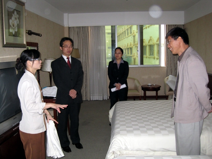在河源假日酒店,高书记一行分别到了酒店阳光中餐厅、包房和客房,与正在各个岗位上工作的实习生交谈,高书记亲切地询问了实习生在这里的工作和生活情况,了解个别学生的家庭状况,并详细了解了实习生在酒店所接受的培训情况和学习计划。高书记指出:“酒店行业是工作环境最好的行业之一,作为餐饮服务人员应该非常细心,能记住客人的主要特征,以便以后提供更周到、亲切和个性化的服务。”