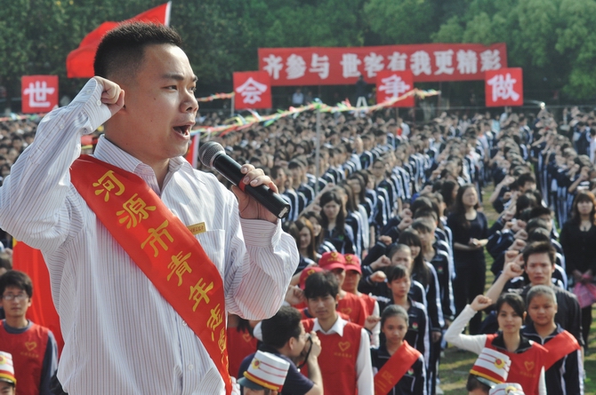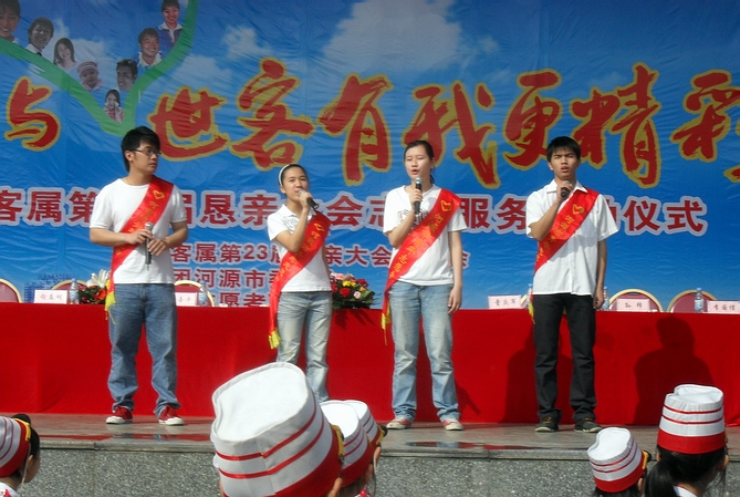 我校团委副书记在启动仪式上代表全市志愿者宣誓,我们一定通过出色的引导、热情的讲解和提示,为世客会描上绚丽的一笔,更为河源形象加上文明的一分。