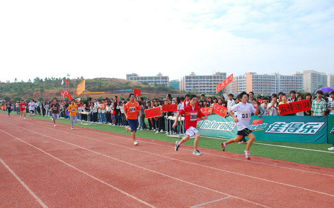 耐力是中长跑比赛中最为关键的因素,这是体力极限的挑战。在男子5000米的赛场上,各二级学院啦啦队挥起院旗,与选手齐跑、为他们助威。最后,工商管理学院冯军宏夺得冠军,机电学院的吴顺雄与陈荣雀分别夺得亚军和季军。