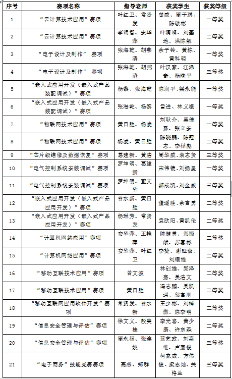 (电信学院通讯员 董海燕)11月—12月期间,我校电信学院共派出25支参赛队伍,参加电子产品芯片级检测维修与数据恢复、云计算技术与应用、嵌入式技术与应用开发等13个赛项,共获得一等奖6项、二等奖10项、三等奖5项的好成绩。目前已确定有4支队伍将代表广东省参加2017年5月举行的全国职业院校技能大赛总决赛。