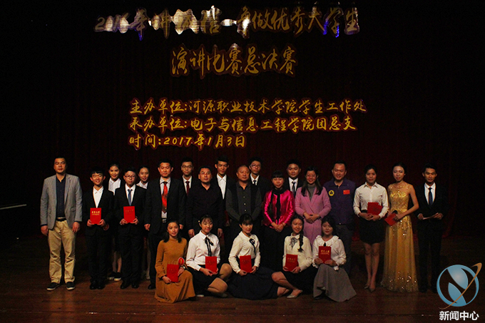 (学生工作处通讯员 曾智祥,学生文字记者 刘欣瑜、吴海霞)1月3日晚,我校于学术报告厅举行2016年“讲诚信,争做优秀大学生”主题演讲比赛。此次演讲比赛以我校全面开展学风建设为契机,大力宣扬社会主义核心价值观。学生工作处处长何智聪、各二级学院团总支书记、指导老师以及电子与信息工程学院学生会干部、400余名学生代表到场为参赛选手加油。国家普通话水平测试考官郑尔君、学生工作处管理科科长邹远泉、国家中级礼仪培训师罗丽丽、河源青年主持人协会秘书长欧阳可强、创业指导师邹建辉等五位担任大赛评委。