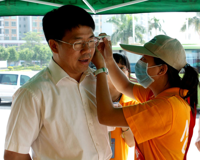 学校党委书记高仁泽在现场亲自为新生检测体温,并到家长休息区慰问新生和家长。高书记在视察中总结了此次迎新工作的三大特点:一、我校在防控甲流措施上做了充分的准备工作。二、今年我校向外省正式招生,吸引了众多外省学子的就读。三、我校今年将实现由千人校园向万人校园的跨越。万人校园的实现,将标志着我校在办学质量、教学效率、教务管理等方面都有质的飞跃,同时也将是整个河源教育体系的一个提升,这不仅将实现我校初期的目标,且给予起初对我校教学抱怀疑、担忧心态的河源市民一个满意的交待。