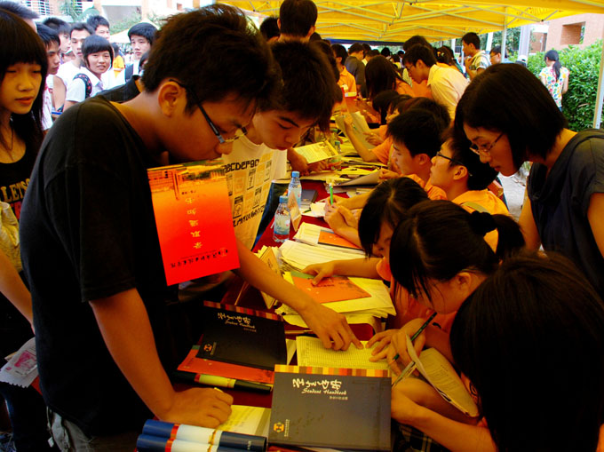 新生兴致昂昂的排队报到签名