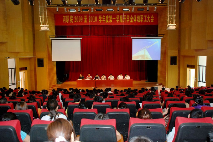 8月28日下午,我校在学术报告厅召开了2009-2010年度第一学期开学全体教职工大会。校领导班子成员及全体教职工出席了此次大会。会上,刘安华校长作了工作部署;韦荣副书记作了关于师德师风建设的报告;高仁泽书记进行了总结发言。会议由陈德清副校长主持。