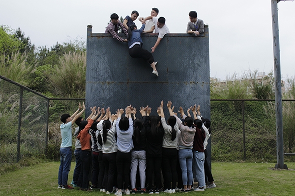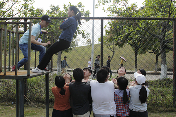 仪式结束后,校团委老师向学员详细讲解并演示了“背摔”、“雷阵”、“毕业墙”等项目的操作细则和要领。全体成员认真学习操作方法,积极参与训练。从考验个人勇气、团队信任的“背摔”、“毕业墙”项目,到考验责任意识、团队协作的“雷阵”环节,成员们积极商量对策,合理分工合作,展现出我校青年学生朝气蓬勃、积极向上的精神风貌和团结友爱、互帮互助的集体主义精神。