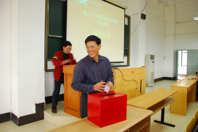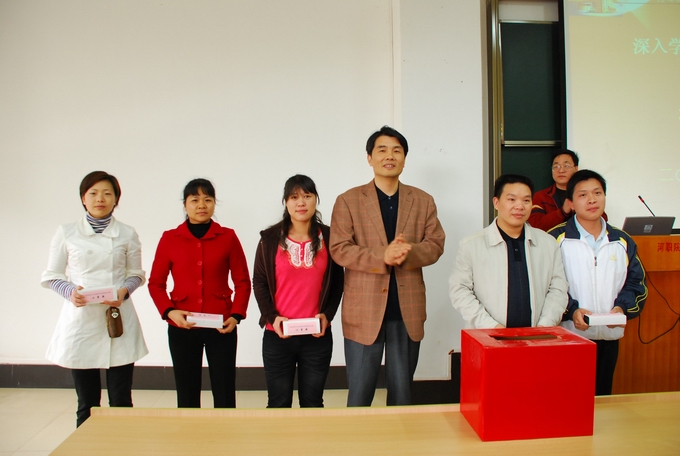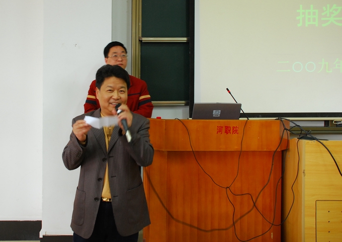 在党委书记高仁泽完成《科学发展观:各级要求与校园实践》讲座后,知识竞赛抽奖活动正式开始。党委书记高仁泽、副校长陈德清、黄向明分别抽出一、二、三等奖,并现场为得奖者颁发精美奖品,以示鼓励,现场气氛十分热烈。活动由党办相关负责人主持。
