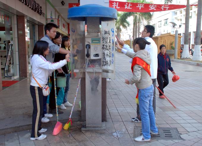 3月14日,我校师范学院青年志愿者服务队和学生会代表走上市区,走进街道,对卫生“死角”、“牛皮癣”等黑色广告进行清理。