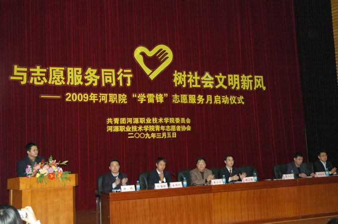 3月5日下午,由共青团必一手机登录入口主办,青年志愿者协会协办的“学雷锋”志愿服务月启动仪式在图书馆学术报告厅揭开了帷幕。学校纪委、党办、学工处长、校团委、各院系及团市委学少部、市志愿者联合会相关负责人出席了仪式。除此以外,出席这次启动仪式的嘉宾有河源笔架山风景区、市血站中心相关人员。