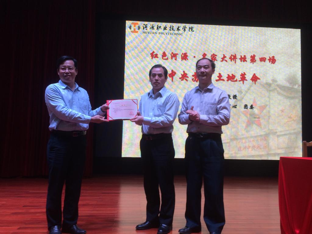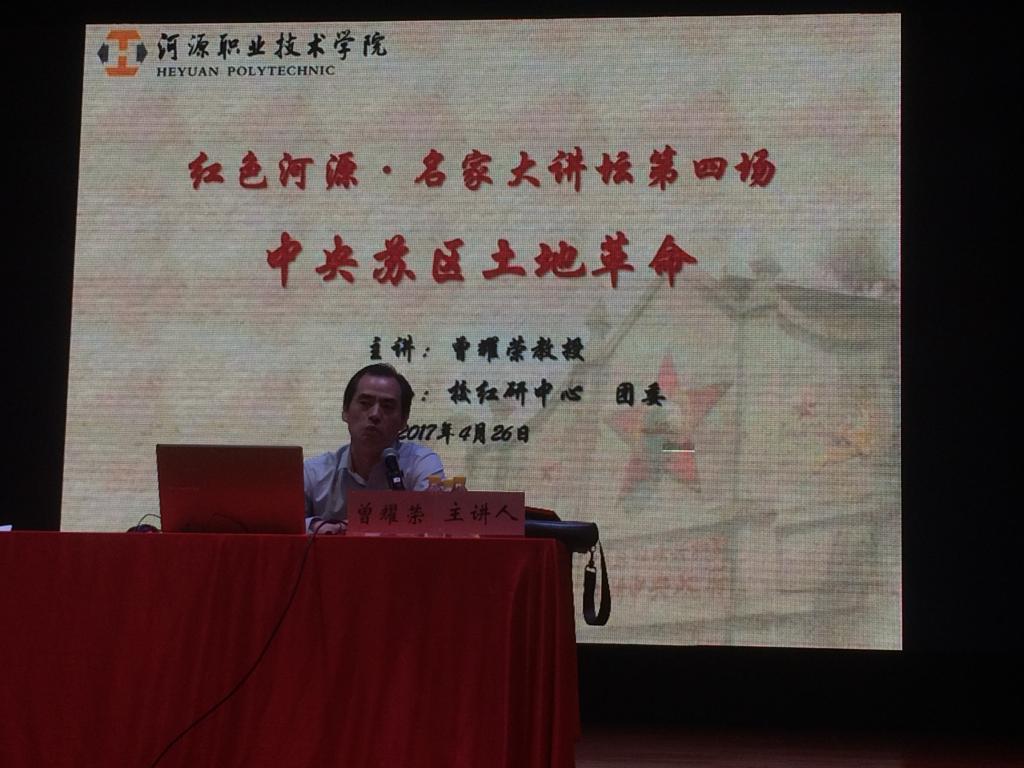 为纪念紫金“四二六”武装暴动胜利90周年,进一步弘扬中国共产党的伟大精神,4月26日下午,由我校红色文化研究中心、团委主办的“红色河源·文化大讲坛”第四场在艺术楼演播厅盛大开讲。本次论坛由南开大学历史学博士、赣南师范大学特聘教授、教育部人文社科重点研究基地中国共产党革命精神与文化资源研究中心副主任曾耀荣担任主讲,我校副校长赖小景担任主持,我校党委副书记韦荣、河源市人大常委会秘书长陈其明、中共河源市委党史研究室副主任杨石健担任特邀嘉宾,出席大会的还有我校监察审计处处长欧阳玉娟、党政办主任黄建华、宣传部部长杨海燕、团委书记陈晓峰、红研中心主任杨党校及师生代表共300余人。