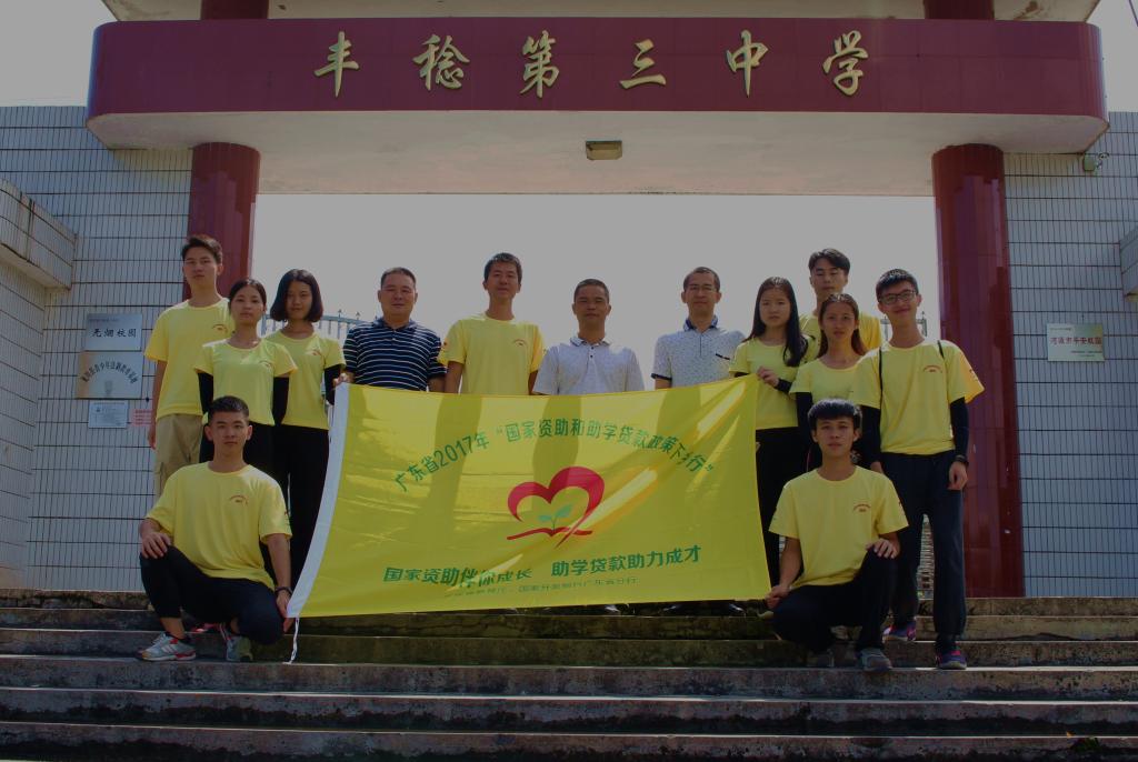 根据《广东省教育厅关于开展广东省2017年“国家资助和助学贷款政策下乡行活动的通知》的文件精神,7月10日到7月17日,我校组织学生志愿者服务队——“筑梦人”及“青春出彩队”在指导老师的带领下,分别到河源市紫金县紫城镇黄花村及龙川县丰稔镇成塘村开展“国家资助和助学贷款政策下乡行”活动。