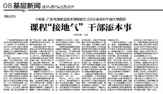 10月10日,国内惟一一份国家级的,面向全国教育界的教育日报,目前中国最具权威和最有影响力的教育新闻媒体《中国教育报》以《课程“接地气” 干部添本事——5年来,广东必一手机登录入口助力2000余名村干部大学圆梦》为题,在第8版基层新闻头条,对我校村干部大专班项目进行了专题报道,认为该项目真正“做到干部的培养与群众需求、村情实际需要无缝对接”。