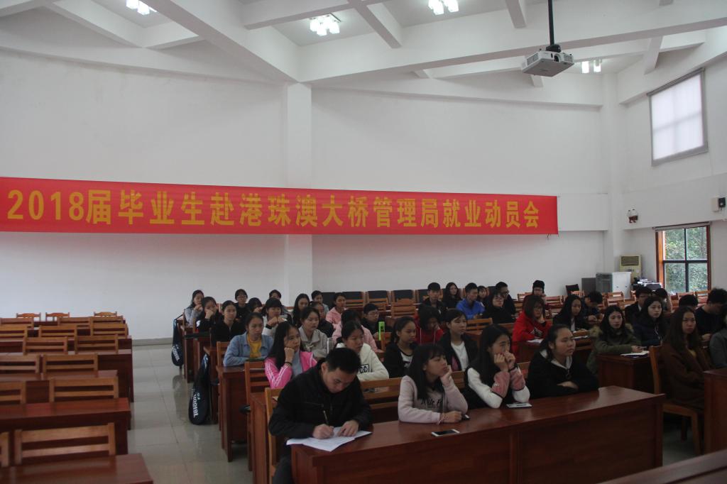 为全面落实十九大“要坚持就业优先战略和积极的就业政策,实现更高质量和更充分就业”的决策部署,深入实施高校毕业生就业创业促进计划,围绕国家建设现代化经济体系目标,面向经济社会发展主战场,向重点领域、重大工程、新兴产业等输送高校毕业生。我校于12月4日上午9时在行政楼C108室召开2018届毕业生赴港珠澳大桥管理局就业动员会。学校主管领导陈农心副校长出席会议并作重要讲话,学工处相关人员、各学院负责就业辅导员、毕业生代表等90多人参加会议。会议由就业中心负责人主持。
