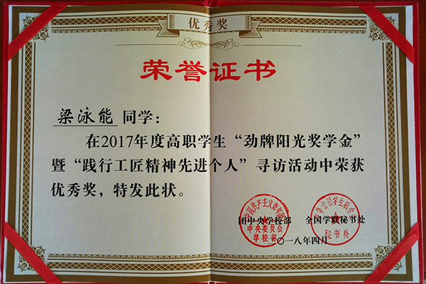 点点滴滴柔水可穿透坚硬岩石,日积月累冰点汇聚庞大冰山。在团中央学校部、全国学联秘书处、劲牌有限公司共同举办的2017年度寻访高职学生“劲牌阳光奖学金”暨“践行工匠精神先进个人”活动中,他荣获了“劲牌阳光奖学金”暨“践行工匠精神先进个人”寻访活动优秀奖,成为青春出彩梦想的代言人。他就是来自我校电子与信息工程学院15级电子信息工程技术2班的梁泳能。
