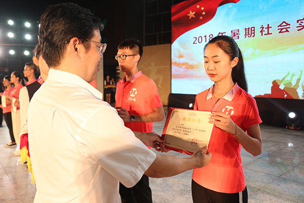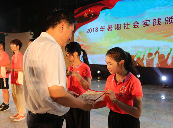 在志愿者表彰环节中,全体师生共同观看了我校2018学年暑期三下乡志愿服务工作的宣传视频,并对其参加社会实践活动的志愿者进行表彰,我校党委韦荣书记,陈德清校长分别为志愿者代表颁发2018年暑期社会实践活动先进个人荣誉证书。