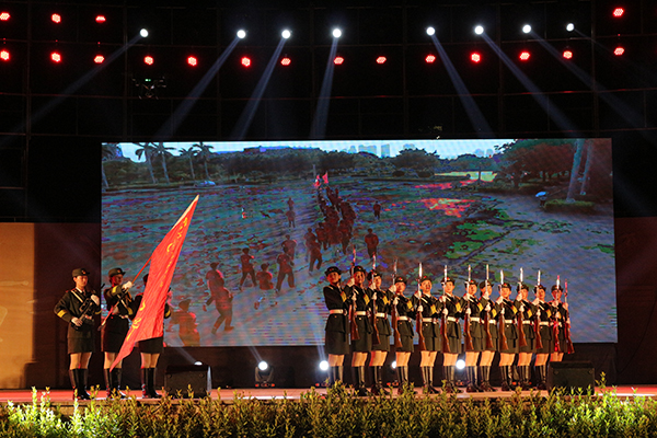 晚会在吉他协会、筑梦乐团带来的热场劲歌中拉开了序幕,接着,在观赏了往届文体艺术节活动回顾视频之后,党委书记韦荣、校长陈德清、宣传部部长赖新优、学工处处长何志聪、团委书记陈晓峰、艺术与设计学院院长杜伟祥共同上台为本届文体艺术节开启帷幕。