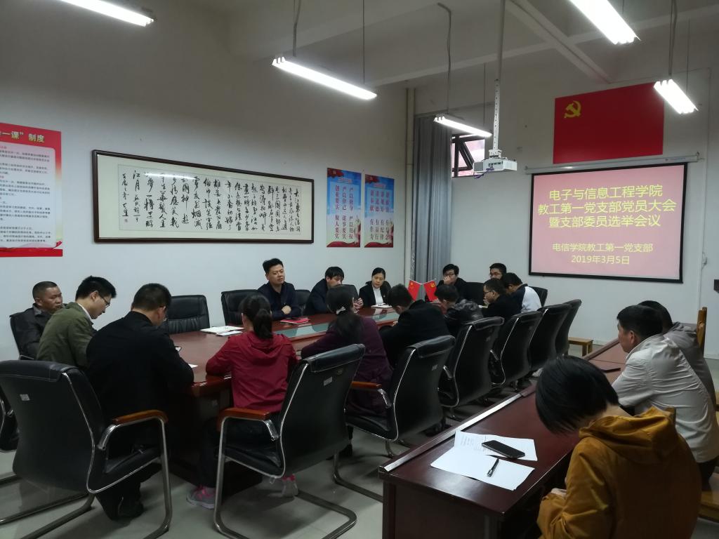 2019年3月5日,电信学院教职工第一党支部在实训楼A208召开了党员大会暨支部委员调整会议,支部全体党员参加会议,会议由黄雷同志主持。