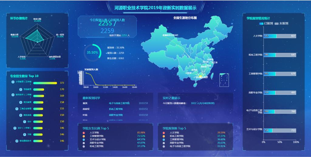 今年,迎新相关数据多系统实现自动同步:包括招生、迎新、一卡通、宿管、财务系统、门禁系统等相关数据的实时自动同步。迎新当日,全部数据实现了大屏幕实时数据展示,对于各院部而言,只需通过系统就能实现数据实时统计和审核,随时一键查询报到数据和新生信息,改变了过去系统不同步造成的信息滞后、信息错误等问题;对于学校领导,通过大屏幕就可以全面了解迎新动态。
