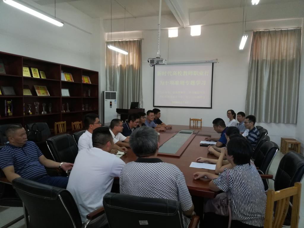 为进一步加强我院师德师风建设,全面提升教师思想政治素质和职业道德水平。2019年9月17日下午,我院组织各专业教师认真学习贯彻《新时代高校教师职业行为十项准则》。