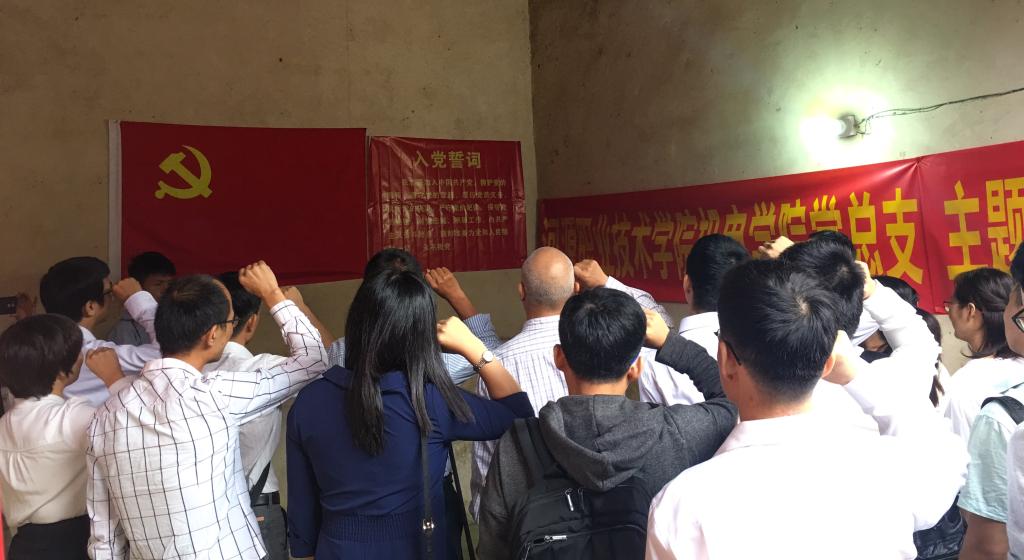 最后,在机电学院党总支书记钟建坤领誓下,教工党员、学生预备党员们面向中国共产党党旗,一起重温入党誓词,铿锵有力的宣誓让现场所有人都深受感染。